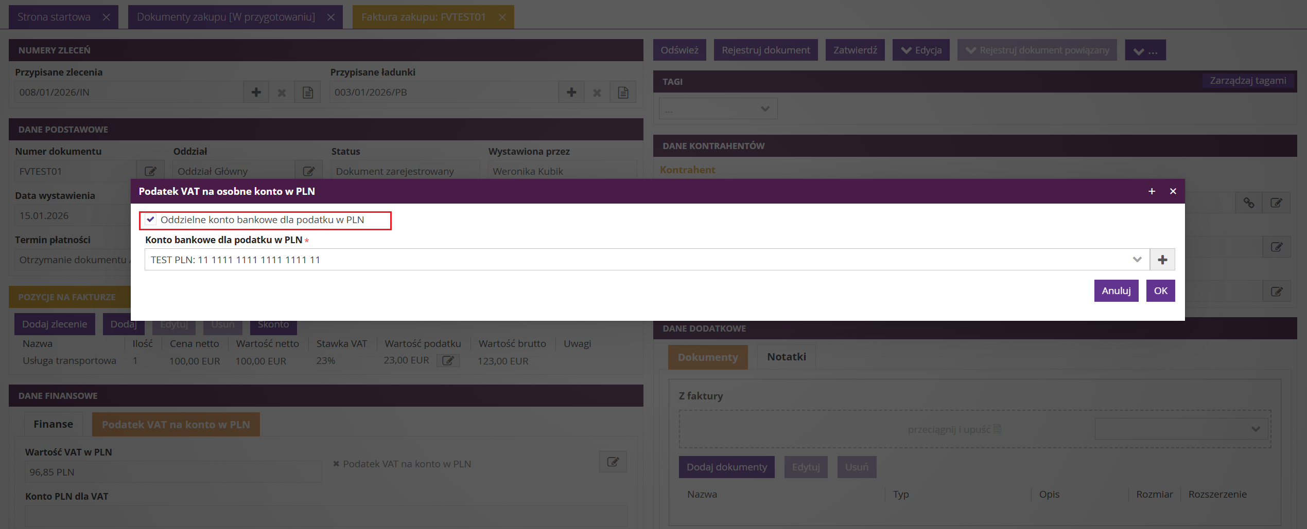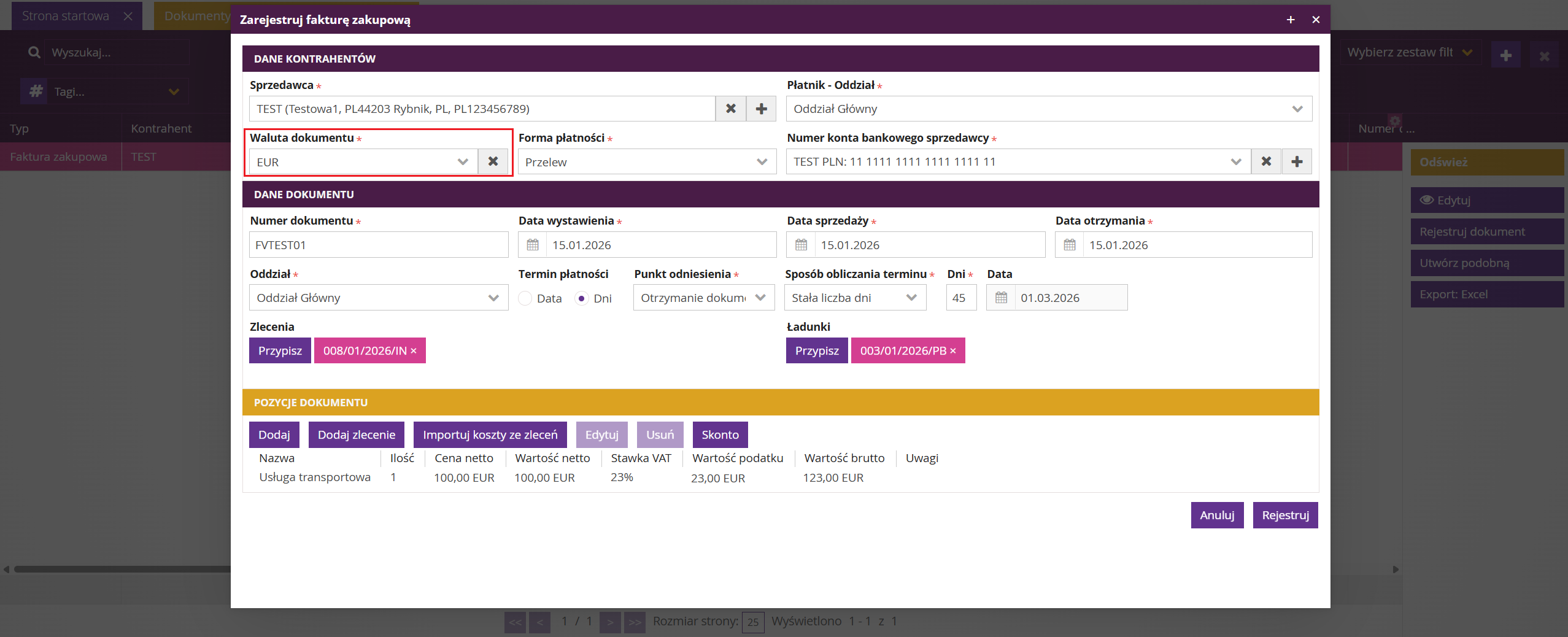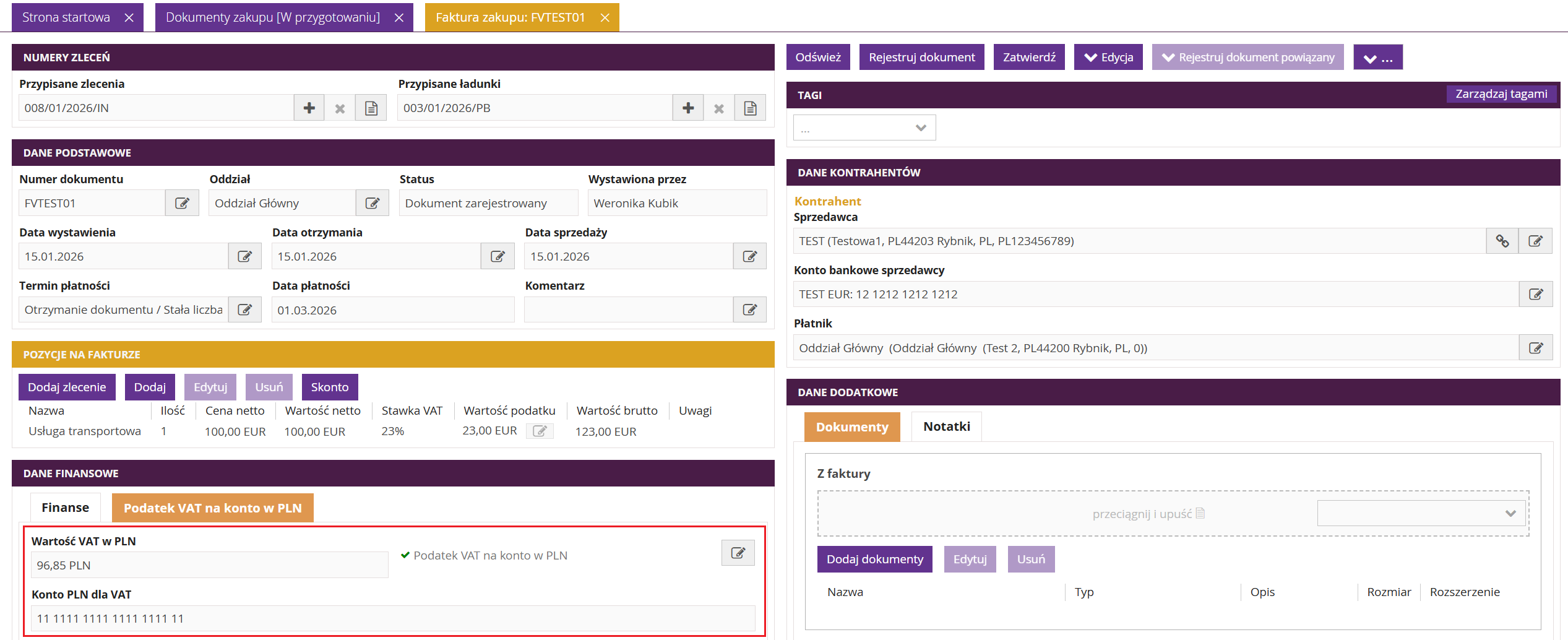 W systemie fireTMS istnieje możliwość zarejestrowania faktury zakupowej z VAT na konto w PLN.