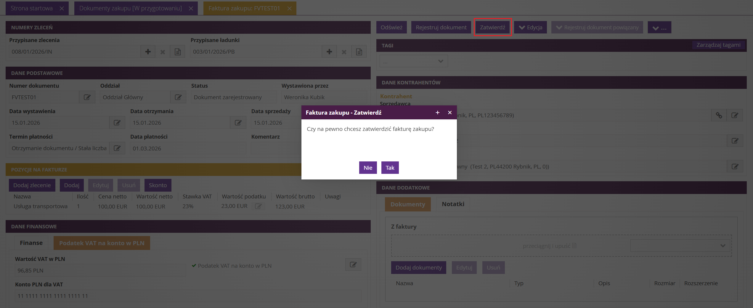 Po uzupełnieniu danych dokument należy zatwierdzić za pomocą opcji Zatwierdź. Zatwierdzona faktura zakupu pojawi się na liście w Księgowość >> Zakupy >> Dokumenty zatwierdzone.
