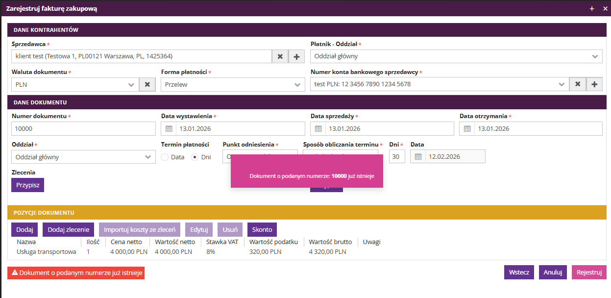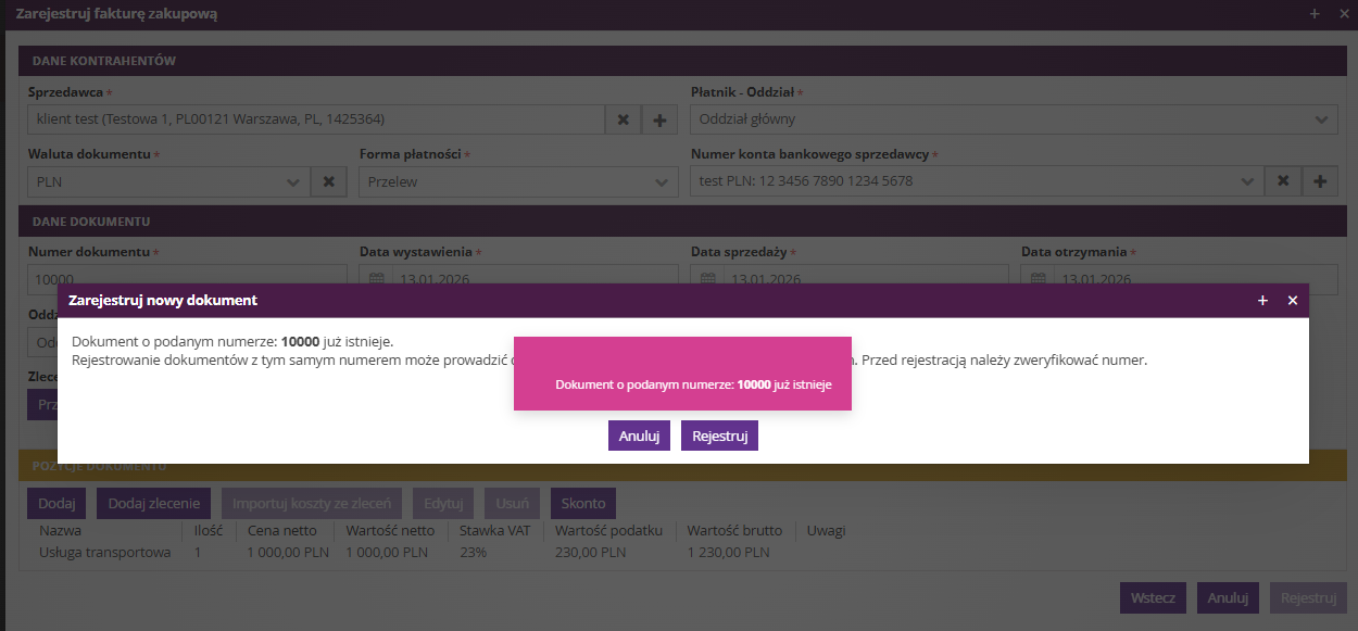 Jeśli wybrano tryb sprawdzania Ostrzeżenie i podczas rejestracji zostanie wprowadzony numer dokumentu, który już istnieje w systemie, pojawi się komunikat Dokument o podanym numerze już istnieje.