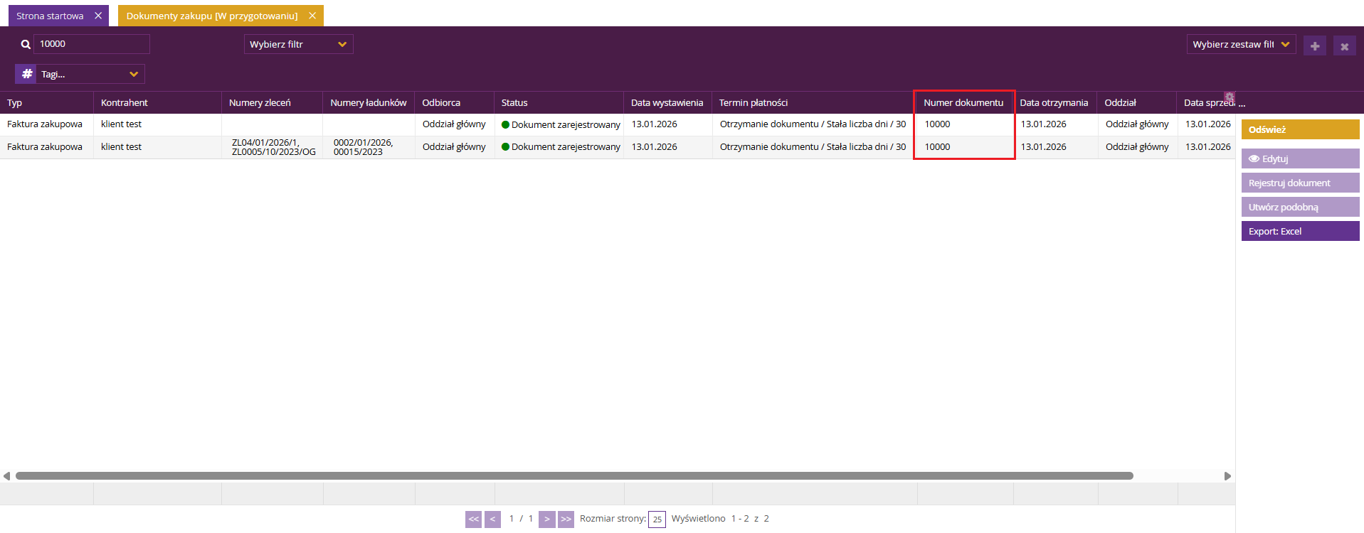 Pomimo komunikatu nadal można zarejestrować fakturę ze wskazanym numerem, a następnie ją zatwierdzić. Na liście faktur zatwierdzonych widoczne będą obie faktury zakupowe z tym numerem dokumentu.